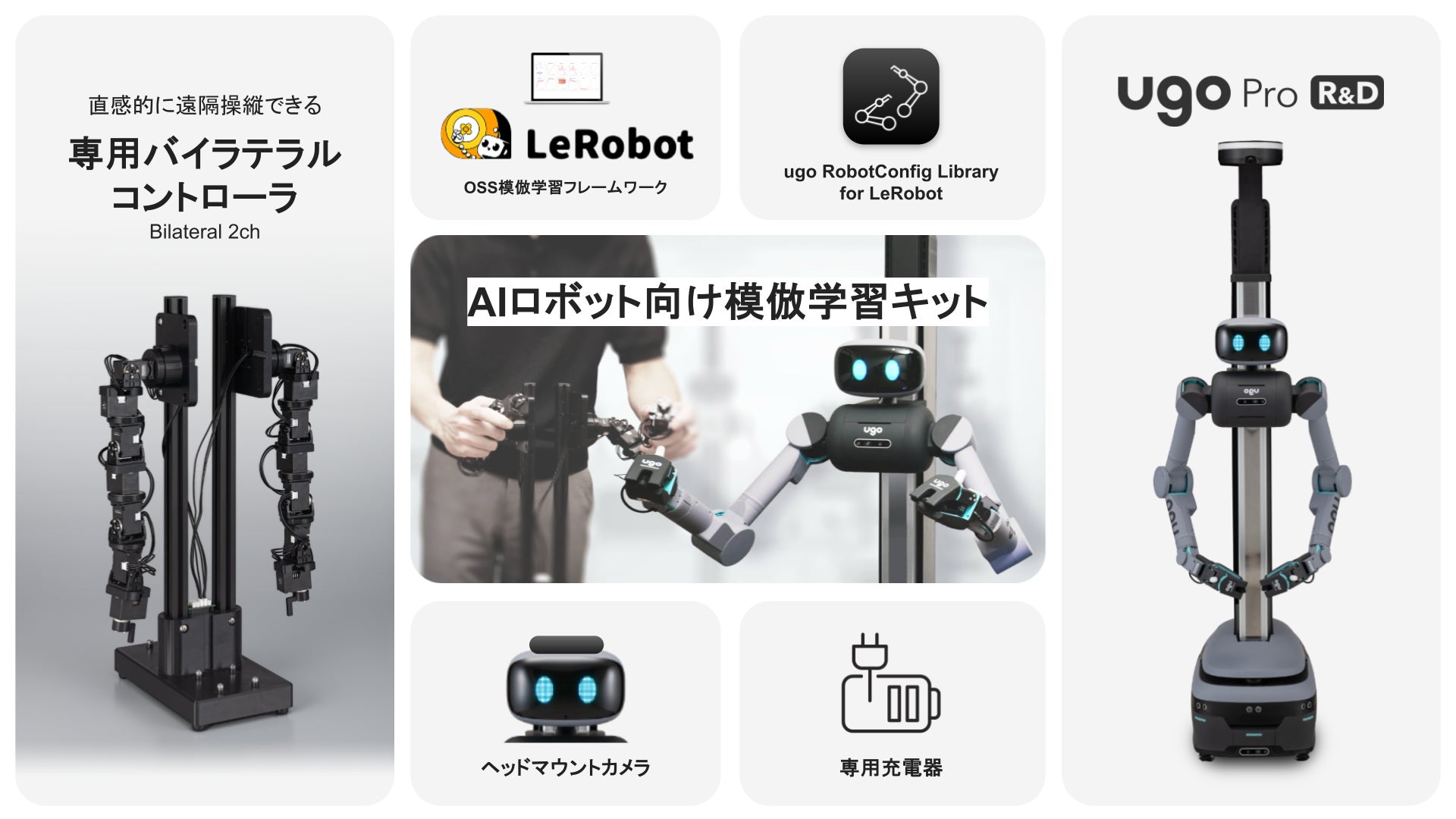 ugoが提供する本キットは、人が行った操作デモ(デモンストレーション)をデータとして収集し、ロボットがその行動を学習する模倣学習(Imitation Learning)に最適化された研究開発用ロボットです。